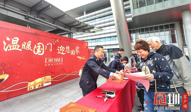 深圳灣邊檢站民警現(xiàn)場揮毫潑墨寫下祝福。