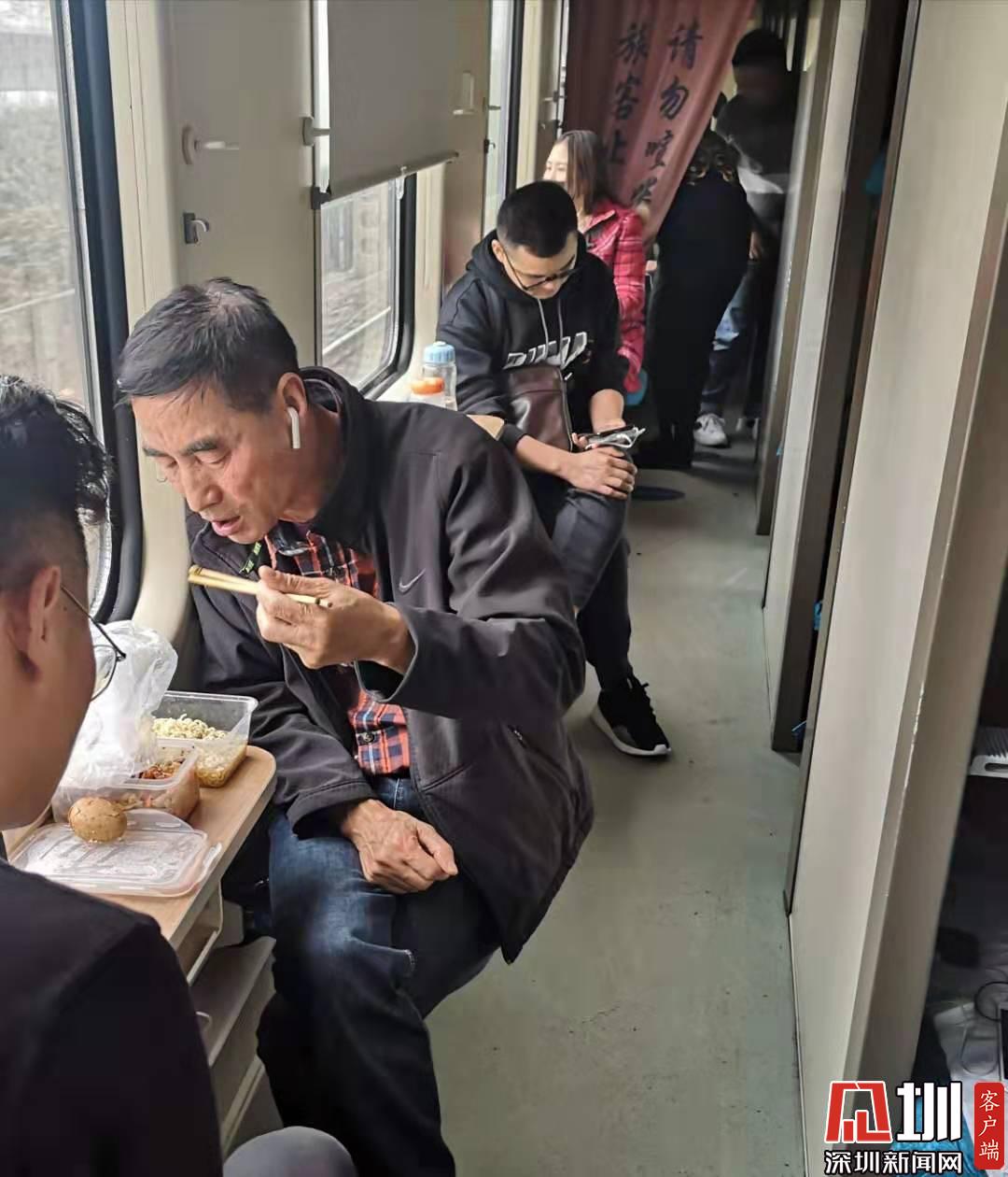 午飯期間,正在吃泡面的老人家是和我一起到終點(diǎn)站的東北人,他和妻子年輕時就來深圳打拼,每一年無論春運(yùn)的車票多么難搶,他和伴都必須回家過年,他說回到東北,聽著大家說的方言,熱熱鬧鬧的,才覺得這個年過得有意義。