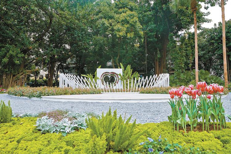 ▲玫瑰之約月季主題花園布置了心形創(chuàng)意花臺(tái)。