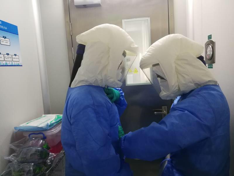 ▲大年三十,深圳市第三人民醫(yī)院實驗室正在進行確診患者的病毒載量動態(tài)檢測,他們在操作的時候穿著重達3至4斤的個人防護裝備,進去一次就連續(xù)工作4個小時左右,每次出來內衣全部濕透。