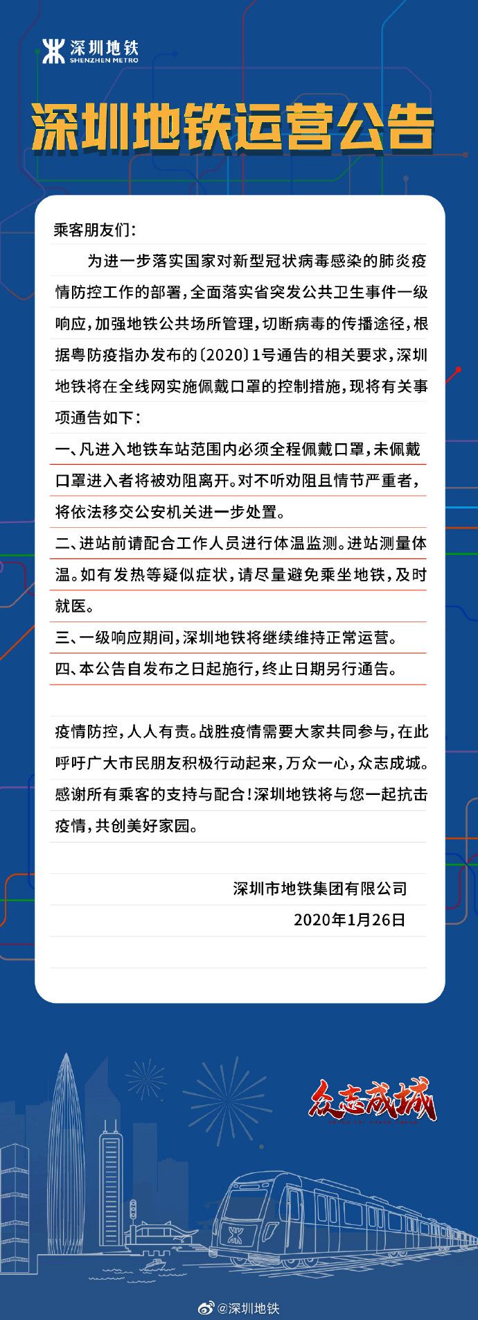 見(jiàn)圳客戶(hù)端·深圳新聞網(wǎng)2020年1月27日訊 深圳地鐵官方微博1月26日發(fā)布運(yùn)營(yíng)公告:根據(jù)粵防疫指辦發(fā)布的〔2020〕1號(hào)通告的相關(guān)要求,為全面落實(shí)省突發(fā)公共衛(wèi)生事件一級(jí)響應(yīng),加強(qiáng)地鐵公共場(chǎng)所管理,切斷病毒的傳播途徑,即日起,凡進(jìn)入地鐵車(chē)范圍內(nèi)必須全程佩戴口罩,未佩戴口罩進(jìn)入者將被勸阻離開(kāi)。對(duì)不聽(tīng)勸阻且情節(jié)嚴(yán)重者,將依法移交公安機(jī)關(guān)進(jìn)一步處置。
