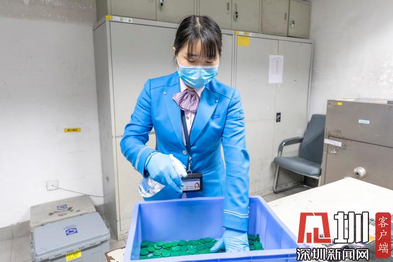 深圳地鐵車站工作人員對(duì)地鐵票卡進(jìn)行消毒。