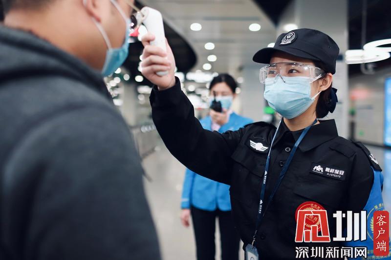 深圳地鐵工作人員對(duì)往來乘客進(jìn)行體溫檢測(cè)。