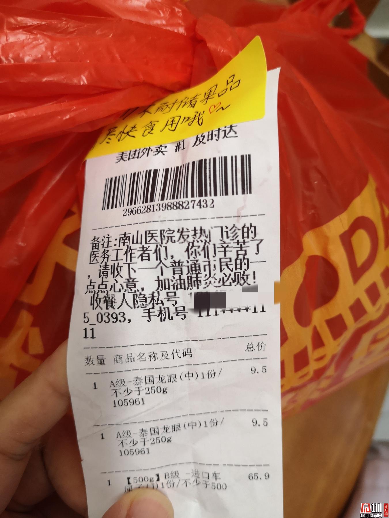 見(jiàn)圳客戶(hù)端·深圳新聞網(wǎng)2020年2月1日訊 (見(jiàn)圳客戶(hù)端、深圳新聞網(wǎng)記者 劉夢(mèng)婷 通訊員 深協(xié)和)“老淚縱橫!”1月30日晚上8點(diǎn)56分,華中科技大學(xué)協(xié)和深圳醫(yī)院(南山醫(yī)院)手外科護(hù)士王敏在朋友圈曬了一張照片,瞬時(shí)網(wǎng)友們紛紛點(diǎn)贊。照片里是一個(gè)紅色塑料袋上貼著一張外賣(mài)單,備注上寫(xiě)著,“南山醫(yī)院發(fā)熱門(mén)診的醫(yī)務(wù)工作者們,你們辛苦了!請(qǐng)收下一個(gè)普通市民的一點(diǎn)點(diǎn)心意,加油,肺炎必?cái)。 ?/p>