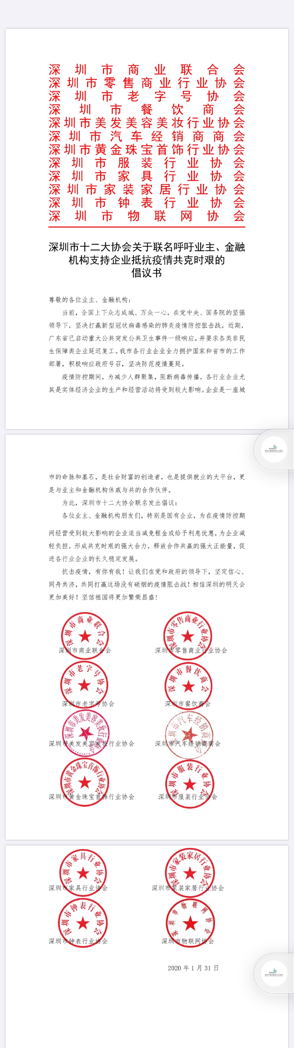 見圳客戶端·深圳新聞網(wǎng)2020年2月1日訊(見圳客戶端、深圳新聞網(wǎng)記者 金洪竹)1月31日深夜,一份特別的倡議書在網(wǎng)絡(luò)熱傳。深圳市商業(yè)聯(lián)合會、深圳市零售商業(yè)行業(yè)協(xié)會、深圳老字號協(xié)會、深圳市餐飲商會、深圳市美發(fā)美容美妝行業(yè)協(xié)會、深圳市汽車經(jīng)銷商協(xié)會、深圳市黃金珠寶首飾行業(yè)協(xié)會、深圳市服裝行業(yè)協(xié)會、深圳市家具行業(yè)協(xié)會、深圳市家裝家居行業(yè)協(xié)會、深圳市鐘表行業(yè)協(xié)會和深圳市物聯(lián)網(wǎng)協(xié)會等12家商協(xié)會發(fā)出聯(lián)名倡議,呼吁業(yè)主、金融機(jī)構(gòu)支持企業(yè)抵抗疫情、共克時艱。