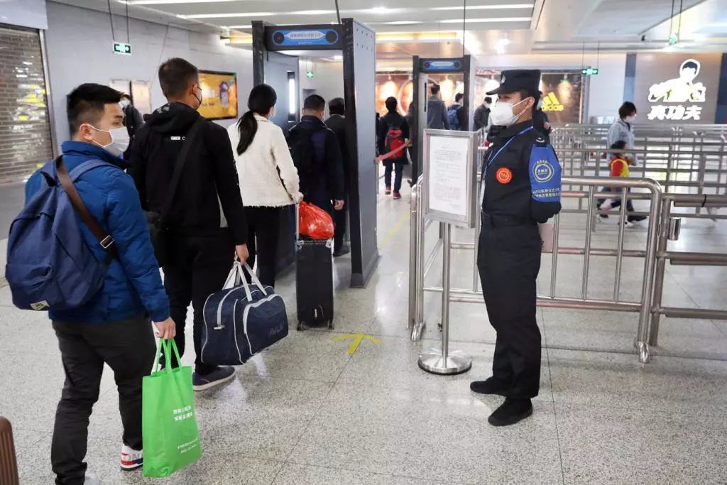在地鐵站入口處,安檢人員檢查乘客是否佩戴口罩,并對(duì)未佩戴口罩人員進(jìn)行勸返。