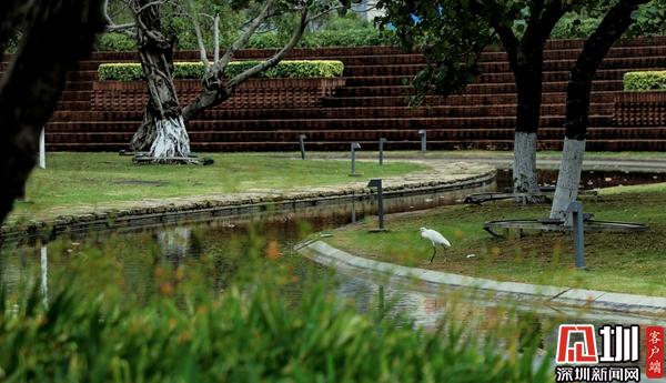 海濱廣場:白鷺棲息在略顯空曠的草地上。