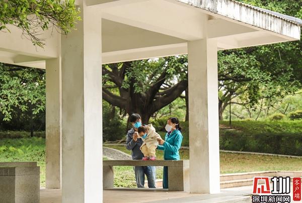 靈芝公園:一對夫妻戴著口罩來公園遛娃。
