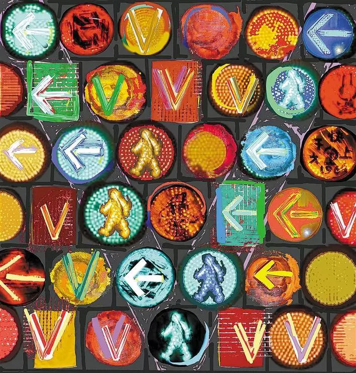 梁宇透露,這件作品的創(chuàng)作四易其稿,將信號燈所指代的“社會規(guī)則”加以排列強化,以此強調“秩序”本身在與疾病博弈混亂環(huán)境中的重要性。作品以濃烈的對比色彩、緊密排列的幾何圖形試圖傳達當下人們的緊張情緒和焦慮心態(tài)。同時,信號燈中“行走”、“前進”、“Victory”的提示標識,被清晰地提煉出來,成為能讓畫面安定的因素,望帶給觀者一點思緒的寧靜與心靈的慰藉。