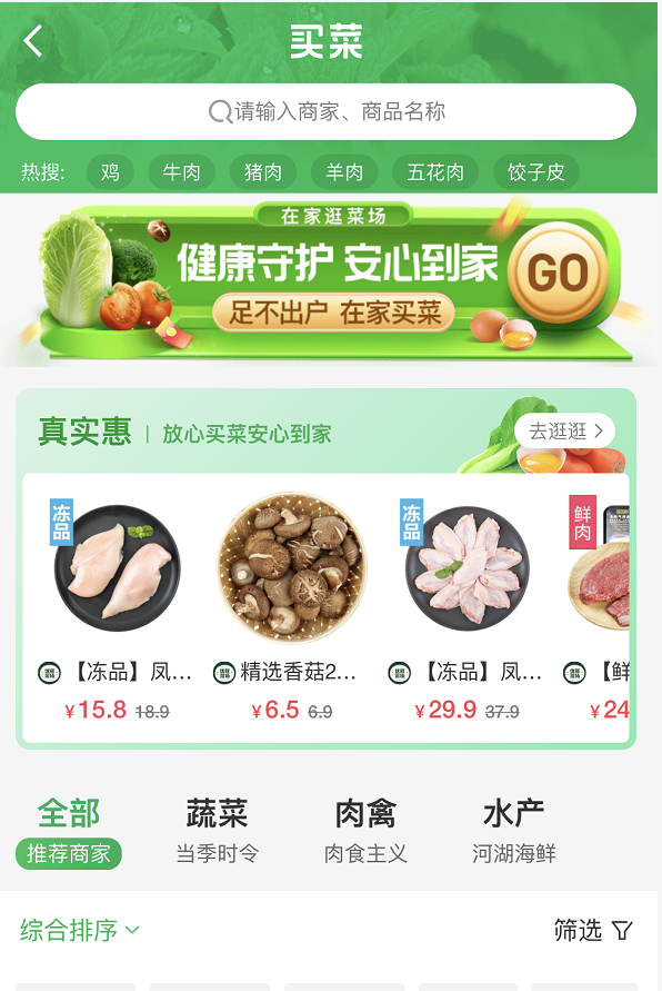 商品情況:店鋪相對(duì)較少,但果蔬肉禽海鮮齊全;另外,部分門店休息中,可先看看自己所在地區(qū)是否提供配送。