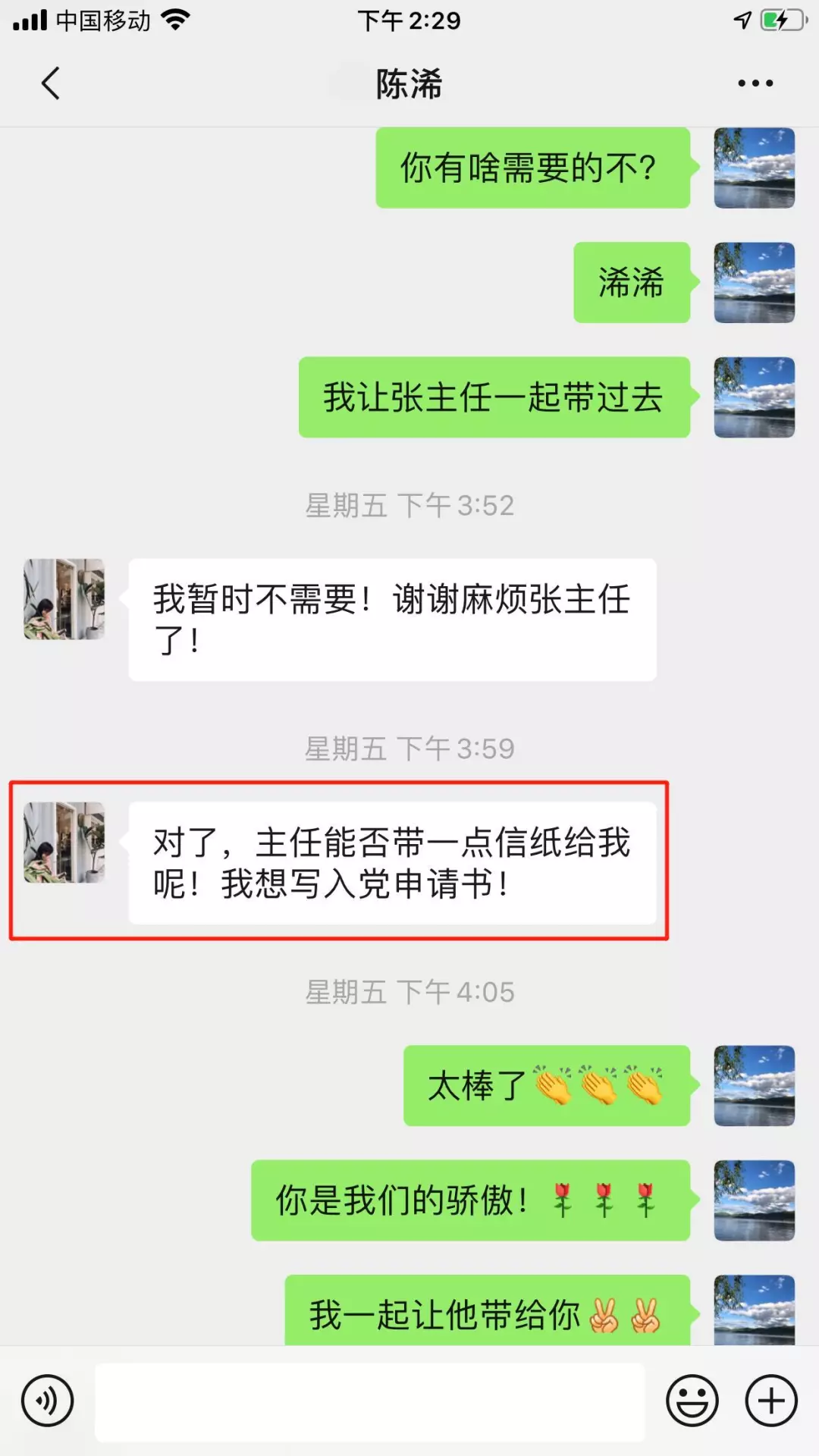陳浠:“我想寫入黨申請書!”