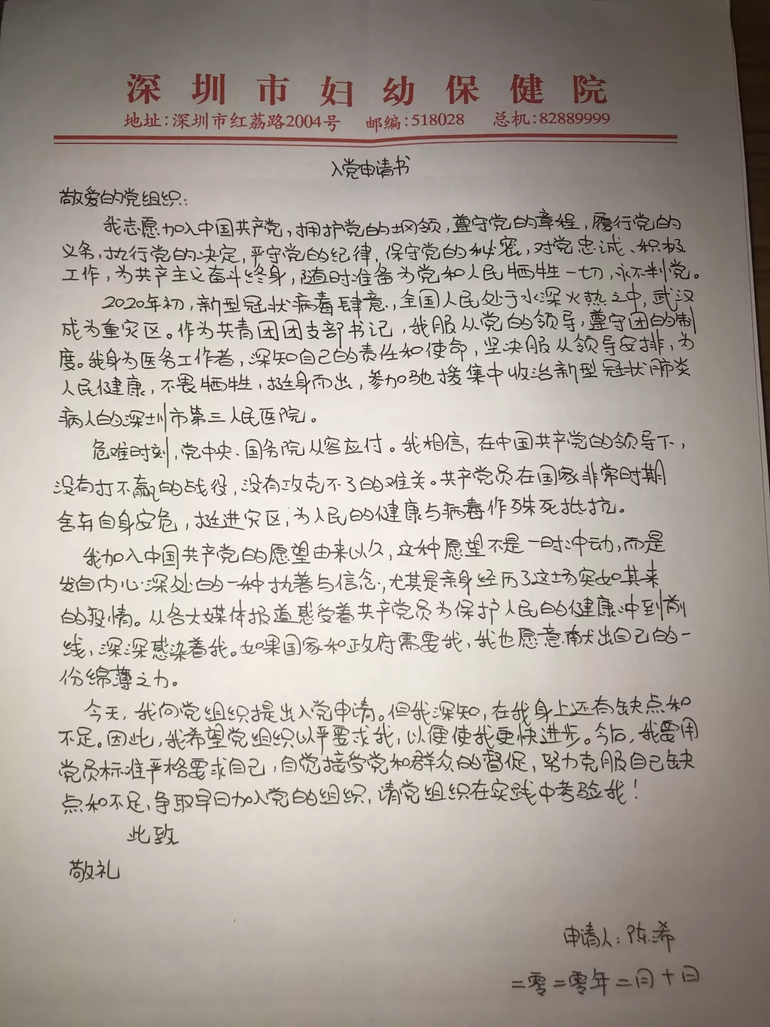 2月10日,陳浠在戰(zhàn)“疫”一線寫的入黨申請書