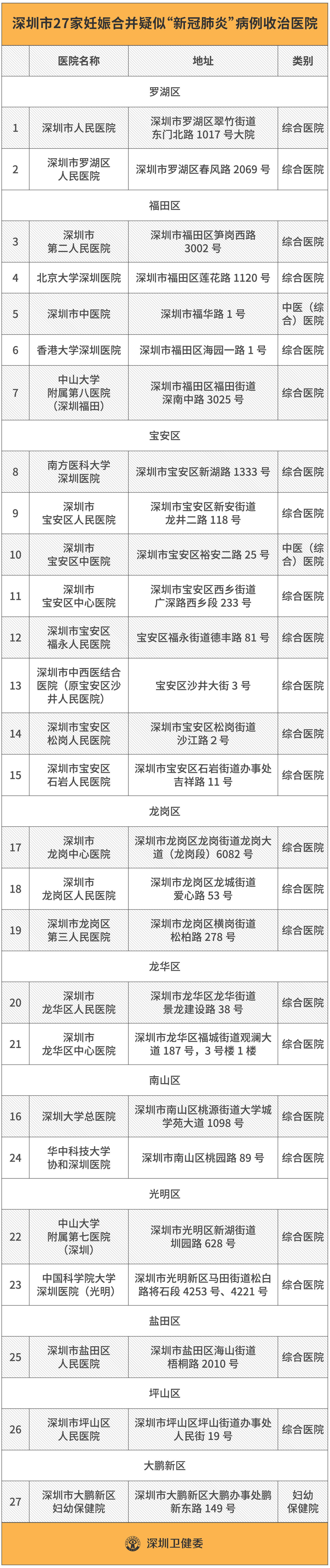 據(jù)悉,深圳共有27家妊娠合并新型冠狀病毒感染感染疑似病例市、區(qū)級收治醫(yī)院,其中,市級醫(yī)院8家,區(qū)級醫(yī)院19家,覆蓋深圳10個區(qū)(新區(qū))。
