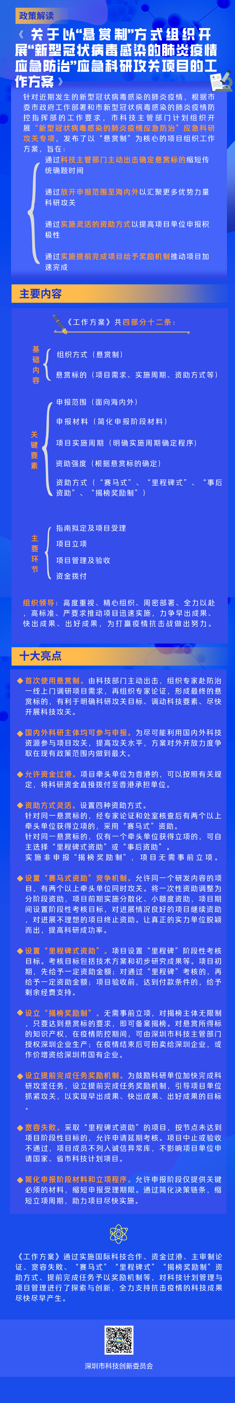 見圳客戶端·深圳新聞網(wǎng)2020年2月13日訊(見圳客戶端、深圳新聞網(wǎng)記者 金洪竹)2月12日,深圳市科創(chuàng)委發(fā)布以“懸賞制”為核心的“新型冠狀病毒感染的肺炎疫情應(yīng)急防治”應(yīng)急科研攻關(guān)專項(xiàng)組織工作方案。該方案旨在通過科技主管部門主動(dòng)出擊、確定懸賞標(biāo)的來縮短傳統(tǒng)科研項(xiàng)目確題時(shí)間,匯聚更多優(yōu)勢(shì)力量科研攻關(guān),提高項(xiàng)目單位申報(bào)積極性,從而推動(dòng)抗疫項(xiàng)目加速完成。