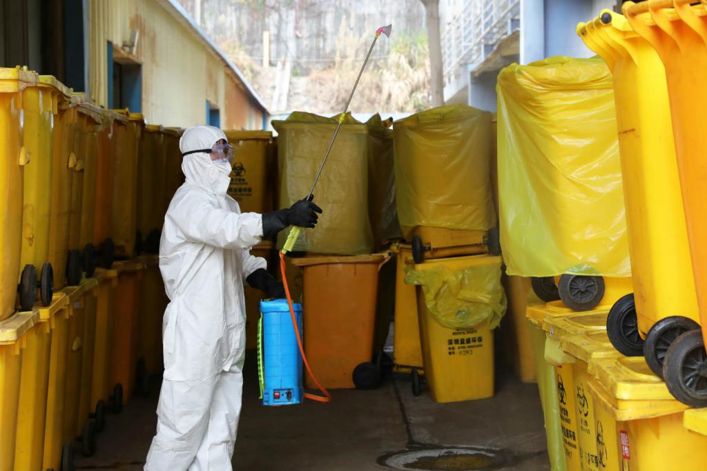 ▲卸完醫(yī)療廢物后,工作人員對堆放區(qū)域進行消毒。