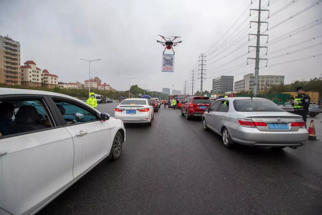 2月11日,在G94高速深圳觀瀾收費(fèi)處,深圳龍華機(jī)訓(xùn)大隊(duì)無人機(jī)飛行隊(duì)的民警操作懸掛有申報(bào)二維碼的無人機(jī)在候檢的車輛間飛行。