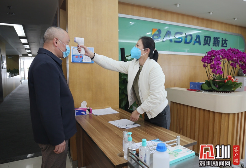 深圳貝斯達(dá)公司員工為進(jìn)出人員測(cè)量體溫。