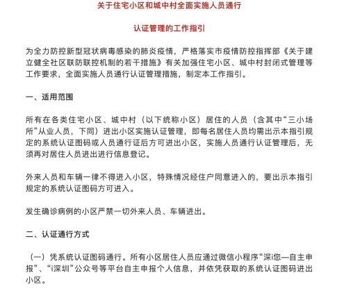 2月9日,深圳發(fā)布《關于住宅小區(qū)和城中村全面實施人員通行認證管理的工作指引》,文中明確表示所有在各類住宅小區(qū)、城中村居住的人員需通過微信小程序“深i您”、“i深圳”公眾號等平臺自主申報個人信息,并依憑獲取健康碼進出小區(qū),無須再做登記。