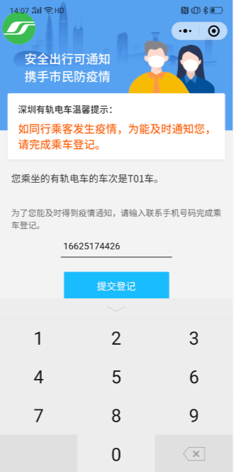 第一步:乘客使用微信掃描列車車廂內(nèi)的登記碼,登記頁(yè)面會(huì)自動(dòng)顯示上次登記的手機(jī)號(hào)或在“深圳通+”小程序中注冊(cè)的手機(jī)號(hào)碼: