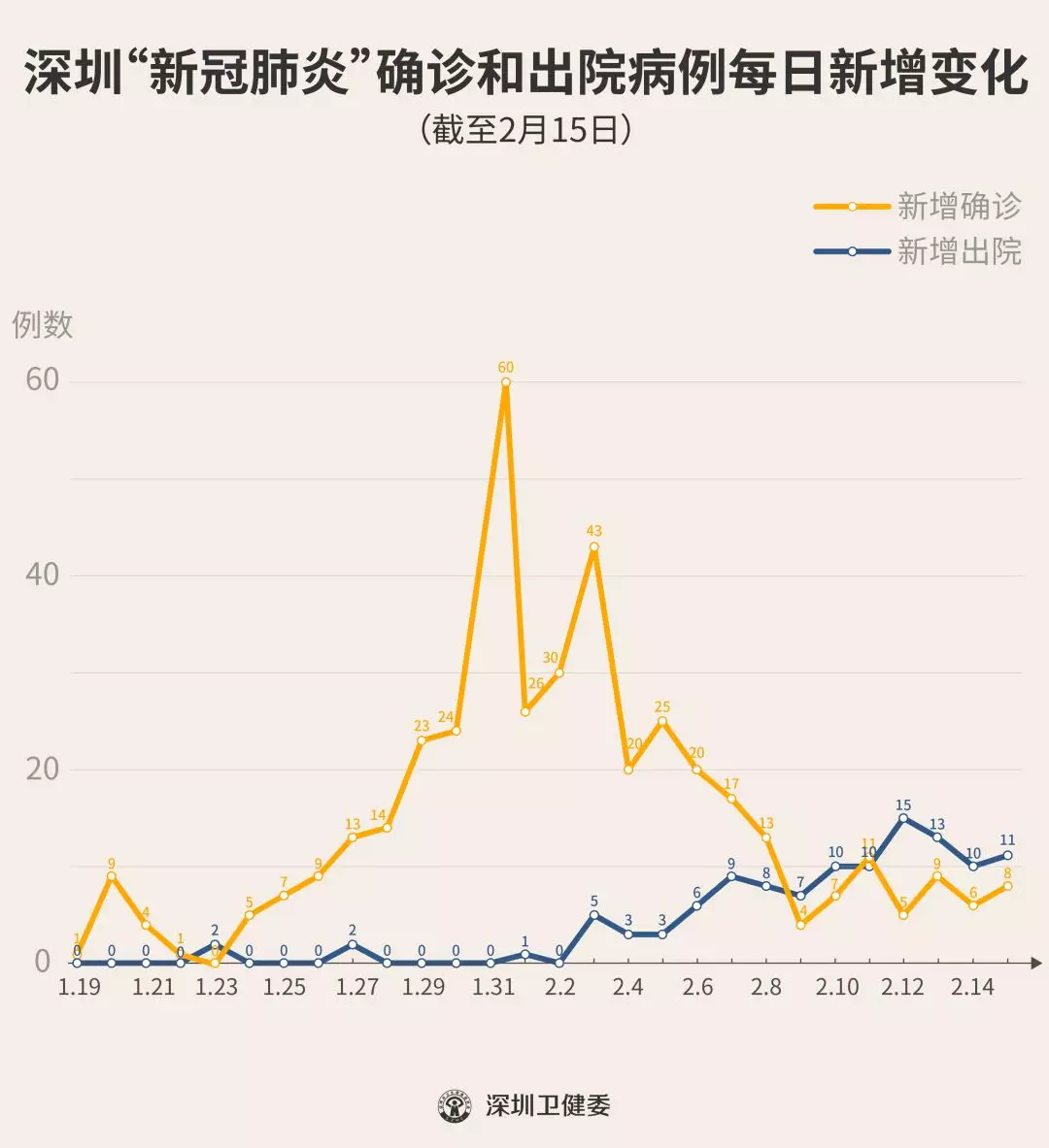 截至2月15日24時,深圳累計報告“新冠肺炎”確診病例414例。2月15日當天全市新增確診病例8例(個案詳情今晚公布)。 ▲新增出院病例已超過新增確診病例 累計報告確診病例中,男性195例、女性219例。 按照病例管理地區(qū)劃分,南山區(qū)87例、福田區(qū)78例、龍崗區(qū)71例、寶安區(qū)62例、龍華區(qū)34例、羅湖區(qū)32例、光明區(qū)11例、坪山區(qū)7例、鹽田區(qū)6例、大鵬新區(qū)2例、其他(指由機場、車站、碼頭、關(guān)口、路卡等直接送往定點醫(yī)院的)24例。 目前,重癥29例、危重癥9例,無死亡病例,累計出院115例。 299例確診病例均在深圳市第三人民醫(yī)院隔離治療。 541例密切接觸者正在接受醫(yī)學(xué)觀察。 資料來源:深圳市疾控中心、深圳市衛(wèi)健委、廣東省衛(wèi)健委