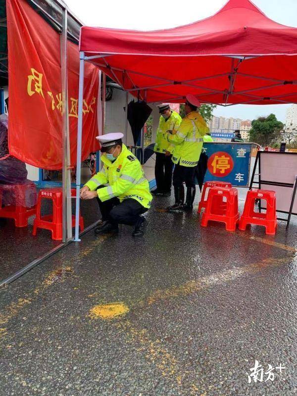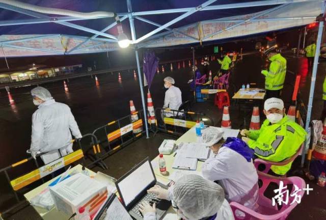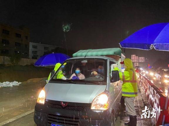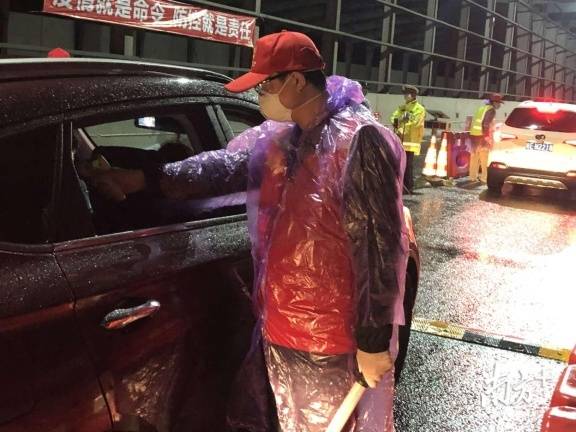 寶安區(qū)羅田檢疫站指揮部總指揮,石巖街道黨工委副書(shū)記、人大工委主任鄧亞虎,石巖街道副主任林志明和羅田交通聯(lián)合檢疫站臨時(shí)黨支部黨員冒雨檢查。當(dāng)晚,深圳市公安局經(jīng)偵支隊(duì)支援4名民警在現(xiàn)場(chǎng)冒雨防疫檢查。