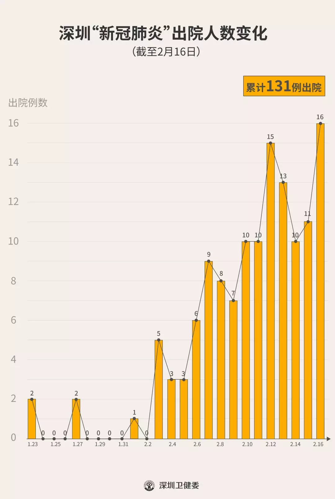 2月16日下午,經(jīng)專家組會(huì)診,深圳再有16名新型冠狀病毒肺炎確診患者出院,累計(jì)達(dá)131人,連續(xù)14天有人出院。