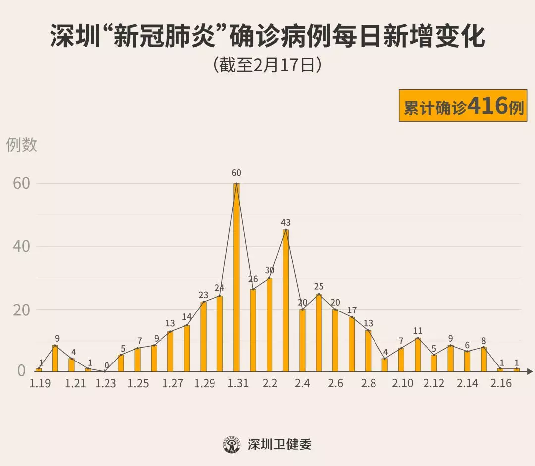 截至2月17日24時,深圳累計報告“新冠肺炎”確診病例416例。2月17日當天全市新增確診病例1例(個案詳情今晚公布)。