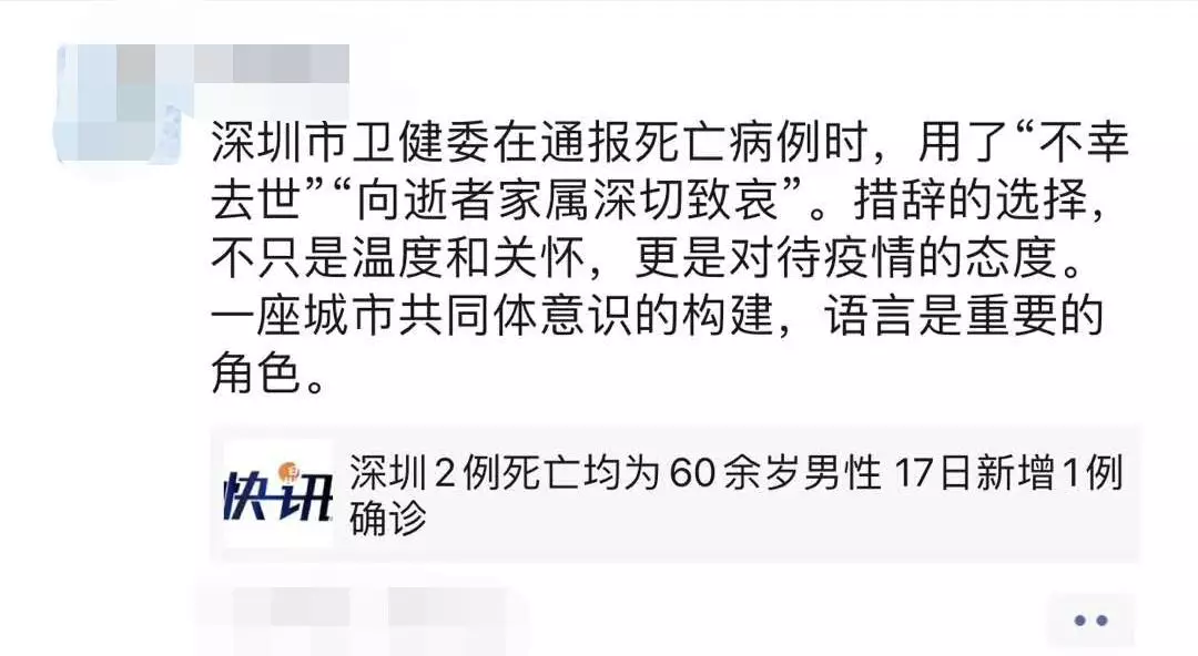 深圳市衛(wèi)健委在通報(bào)死亡病例時(shí),用了“不幸去世”“向逝者家屬深切致哀”。措辭的選擇,不只是溫度和關(guān)懷,更是對(duì)待疫情的態(tài)度。