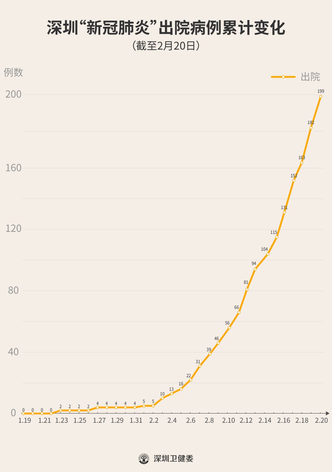2月20日下午,經(jīng)專家組會診,深圳再有17名新型冠狀病毒肺炎確診患者出院,累計(jì)達(dá)199人,連續(xù)18天有人出院。