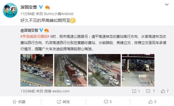久違的早高峰回來(lái)了!“@深圳交警”早上8時(shí)許發(fā)布早高峰路況播報(bào),8時(shí),我市高速公路路況:清平高速神龍收費(fèi)站南行方向、水官高速布龍收費(fèi)站西行方向、機(jī)荷高速西行分別在黃鶴收費(fèi)站、水朗路段、秀峰立交,排榜立交呈現(xiàn)車(chē)多緩行情況。