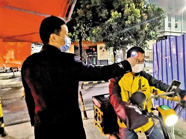 民治街道上芬社區(qū)網(wǎng)格員在卡點為進(jìn)出人員進(jìn)行體溫檢測。