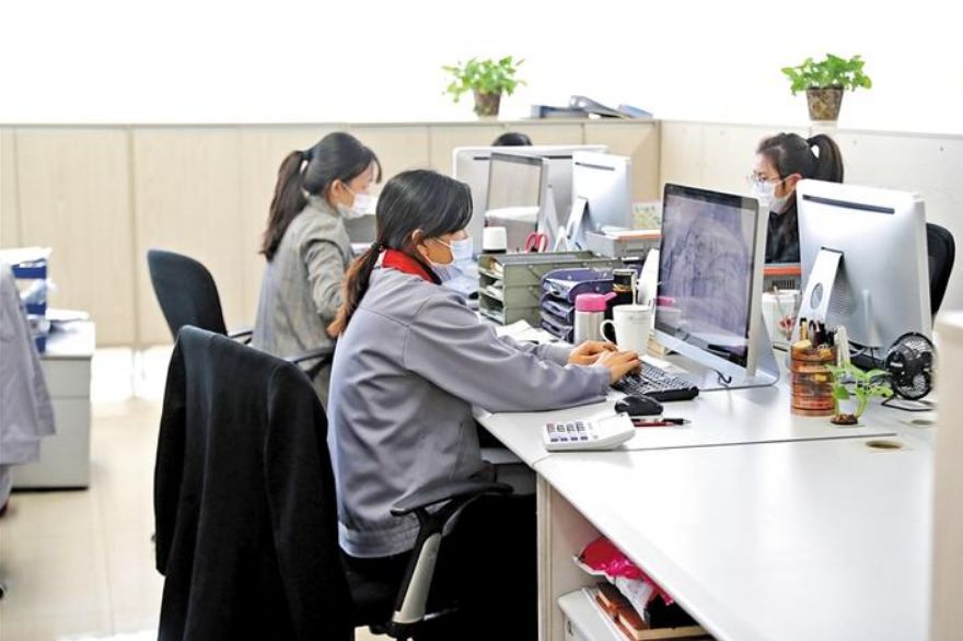 位于觀瀾街道的國(guó)橋?qū)崢I(yè)(深圳)有限公司,員工帶著口罩有序辦公。