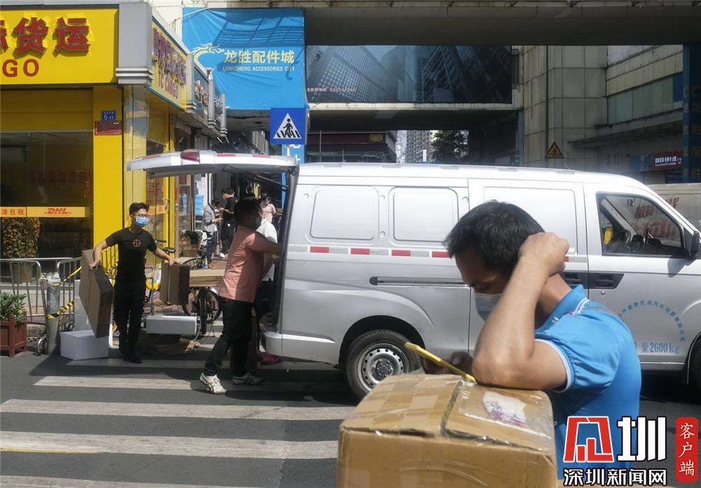 華強(qiáng)北龍勝配件城附近,搬運(yùn)貨物的人均有佩戴口罩。
