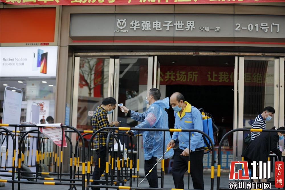 華強(qiáng)電子世界深圳一店入口,工作人員正在為入場者測量體溫。