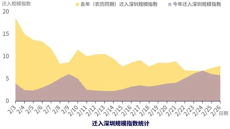 年前,深圳人口達(dá)2000萬(wàn)人,春節(jié)期間最低830多萬(wàn)人。從百度地圖遷徙-春運(yùn)期間遷入深圳趨勢(shì)可以看到,相比去年,年后遷入深圳規(guī)模較去年一直呈現(xiàn)平穩(wěn)的低態(tài)勢(shì),但在2月9日呈現(xiàn)出一波返程小高峰,2月14日,在深人數(shù)約1300萬(wàn)人,目前約1600萬(wàn)人,也就是說(shuō)年后至今約有七百多萬(wàn)人從外地返回深圳。