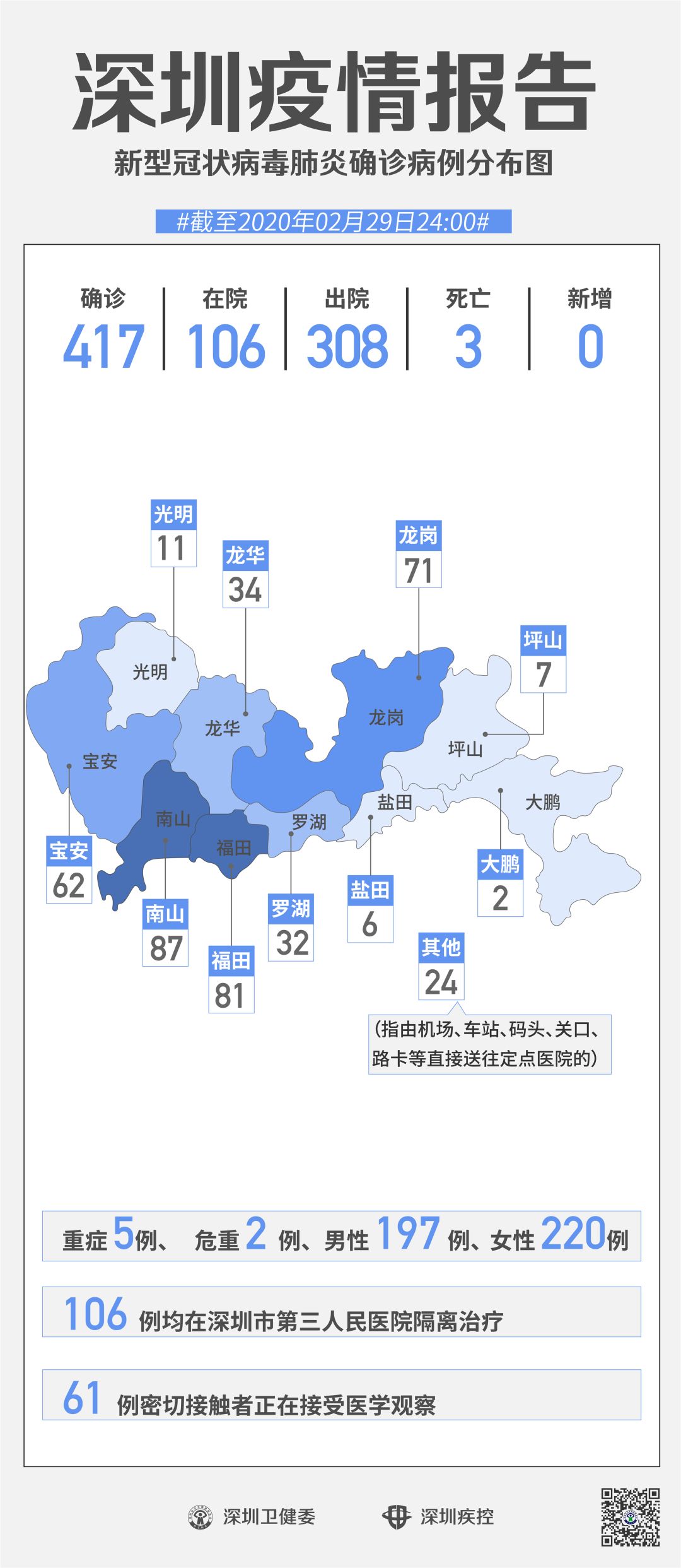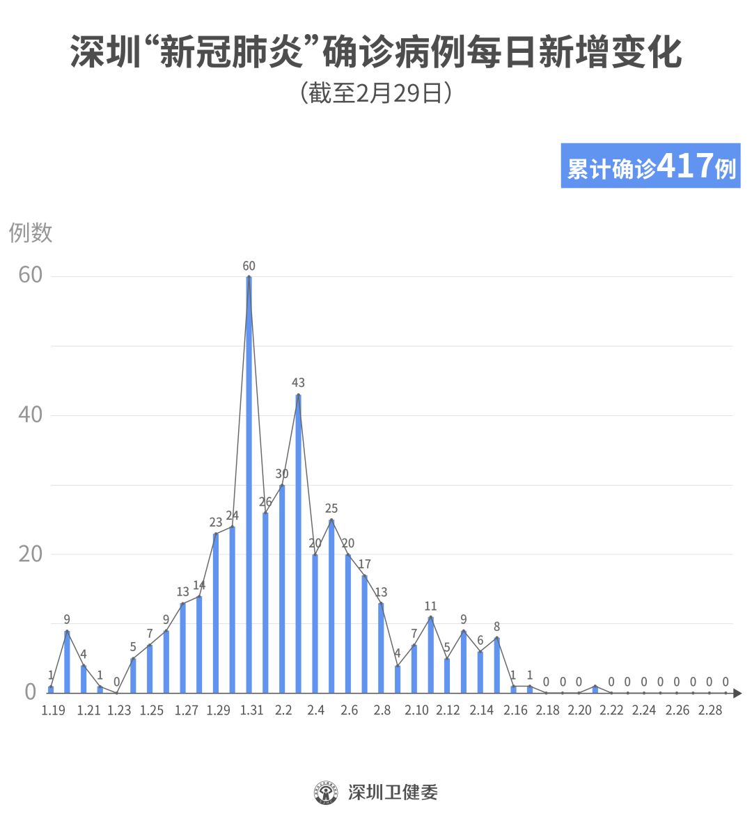 截至2月29日24時(shí),深圳累計(jì)報(bào)告“新冠肺炎”確診病例417例。2月29日當(dāng)天全市無新增確診病例,當(dāng)天出院病例9例(從26日起不再公布出院個(gè)案)。