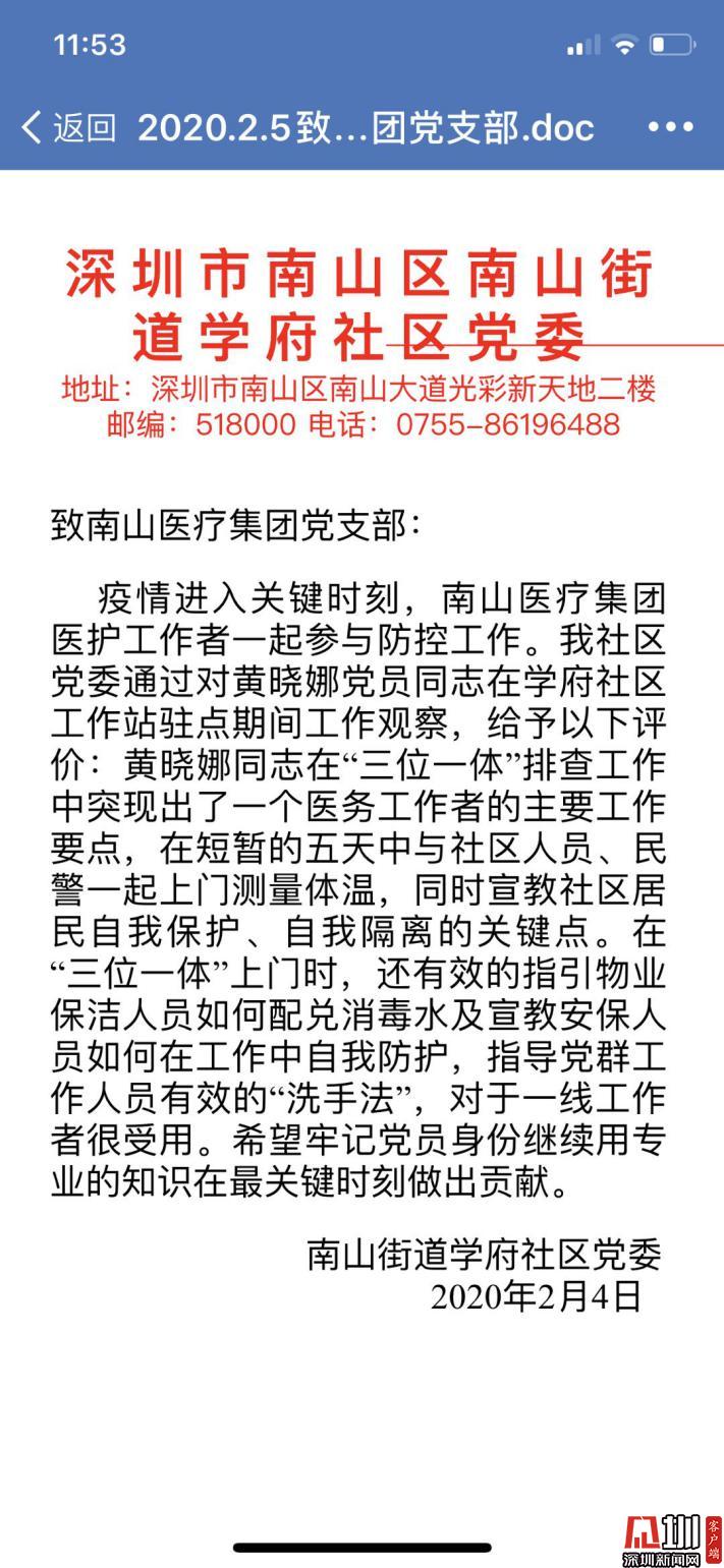 在學府社區(qū)工作站駐點期間,黃曉娜用專業(yè)知識在控制疫情最關鍵時刻,為社區(qū)居民做出貢獻,并收到了南山區(qū)南山街道學府社區(qū)黨委的感激表揚。