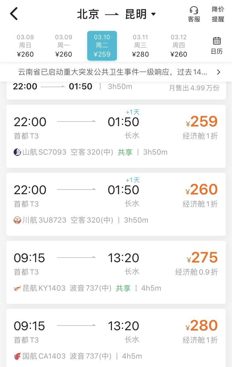 此外,3月份,由北京、上海等城市出發(fā)的航班也出現(xiàn)了1折左右的"白菜價"。比如去哪兒旅行 APP上顯示,3月10日,北京飛昆明的山航 SC7093航班,機(jī)票價格最低為259元,折扣為經(jīng)濟(jì)艙全票的1折。當(dāng)天,川航3U8723、昆航 KY1403、國航 CA1403等航班的最低票價,也僅為經(jīng)濟(jì)艙全票的1折左右,價格分別為260元、275元、280元。