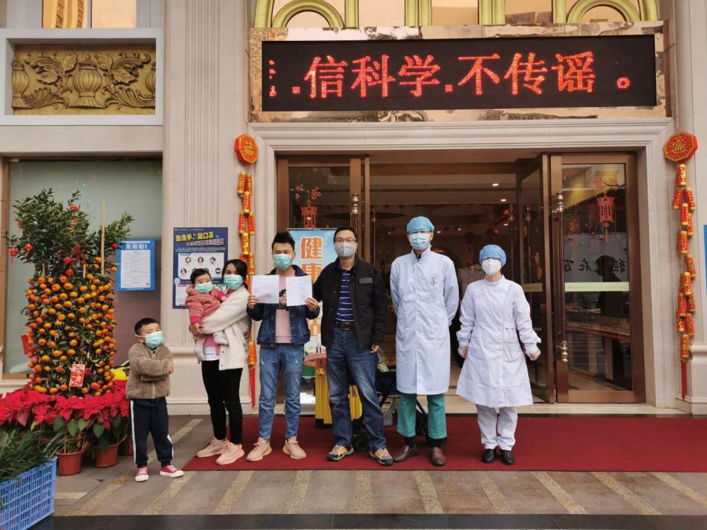 ▲2月10日,健康驛站第一家醫(yī)學(xué)觀察家庭離站時(shí)的合影。呂志軍供圖