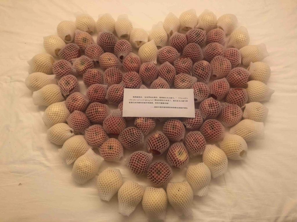 ▲深圳中醫(yī)肛腸醫(yī)院醫(yī)療團(tuán)隊(duì)為健康驛站醫(yī)學(xué)觀察人員贈(zèng)送的愛心水果。受訪者供圖