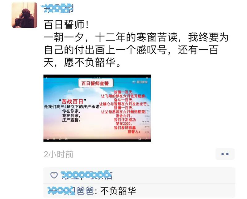 “生于非典,考于新冠,2020,我們注定不凡!疫情當(dāng)前,雖然我們隔離在家,不能像往屆那樣,齊聚學(xué)校體育館舉行誓師大會(huì),意氣風(fēng)發(fā)地走進(jìn)學(xué)校精心準(zhǔn)備的“成功門”,伴隨奮進(jìn)的樂聲高喊出我們的誓言,在“簽名紀(jì)念墻”上寫下對(duì)未來的期盼。但即使相隔網(wǎng)絡(luò)兩端,我們依然有老師祝福和引導(dǎo),有家長(zhǎng)的鼓勵(lì)和支持,有同窗的幫助和陪伴,高考百日,我們?nèi)栽谝黄鹫癖鄹吆簦?020高考,我們準(zhǔn)備好了?!?/p>