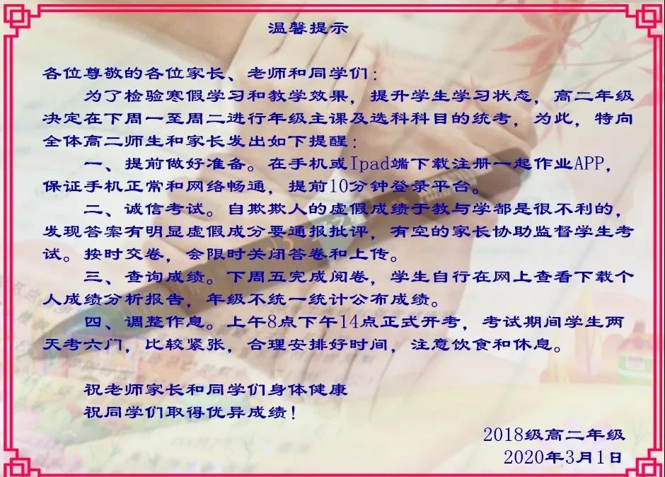 為了提高考試的可信度,考前各班級(jí)還進(jìn)行了誠(chéng)信教育,讓學(xué)生明白誠(chéng)信考試的重要性以及自欺欺人的危害,并發(fā)動(dòng)居家的家長(zhǎng)積極配合監(jiān)考??记埃瑢W(xué)校也向老師學(xué)生和家長(zhǎng)發(fā)了提示,提醒網(wǎng)上考試注意事項(xiàng)。