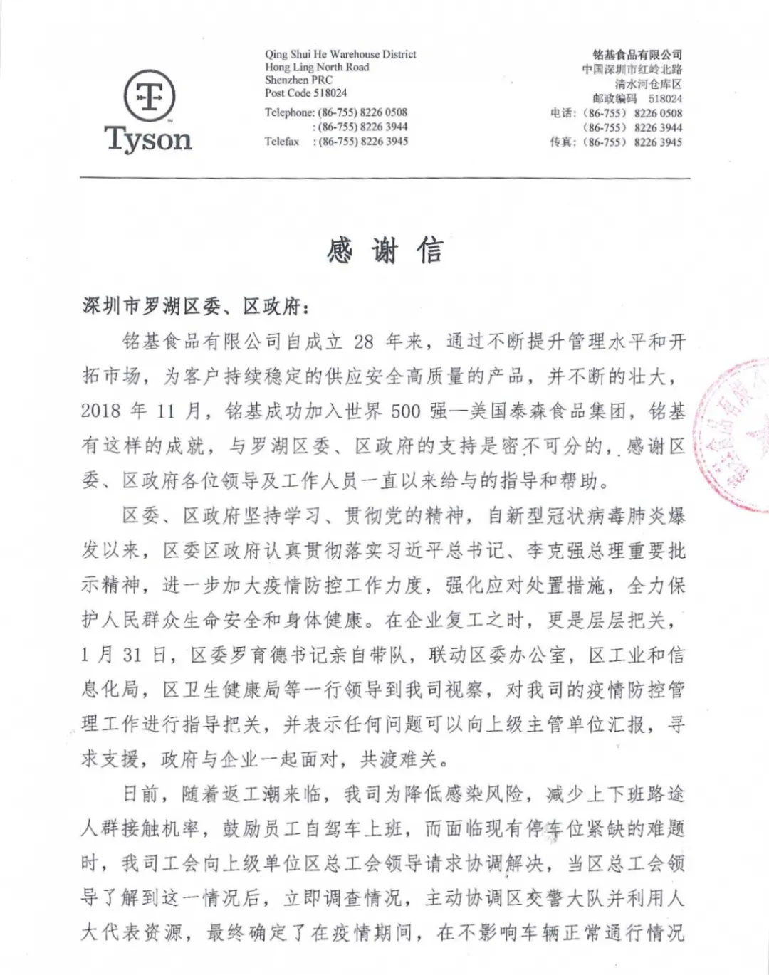 中銀信息技術(shù)服務(wù)(深圳)有限公司、銘基食品有限公司在復(fù)工復(fù)產(chǎn)后都遇到了一些困難,羅湖工會(huì)了解了他們的情況后,主動(dòng)發(fā)揮工會(huì)作用,幫企業(yè)解決困難,協(xié)助他們順利復(fù)工復(fù)產(chǎn)。近日,兩封感謝信送到了羅湖區(qū)委、區(qū)政府,向羅湖羅湖區(qū)委、區(qū)政府以及羅湖各級(jí)工會(huì)為企業(yè)的付出表示感謝。