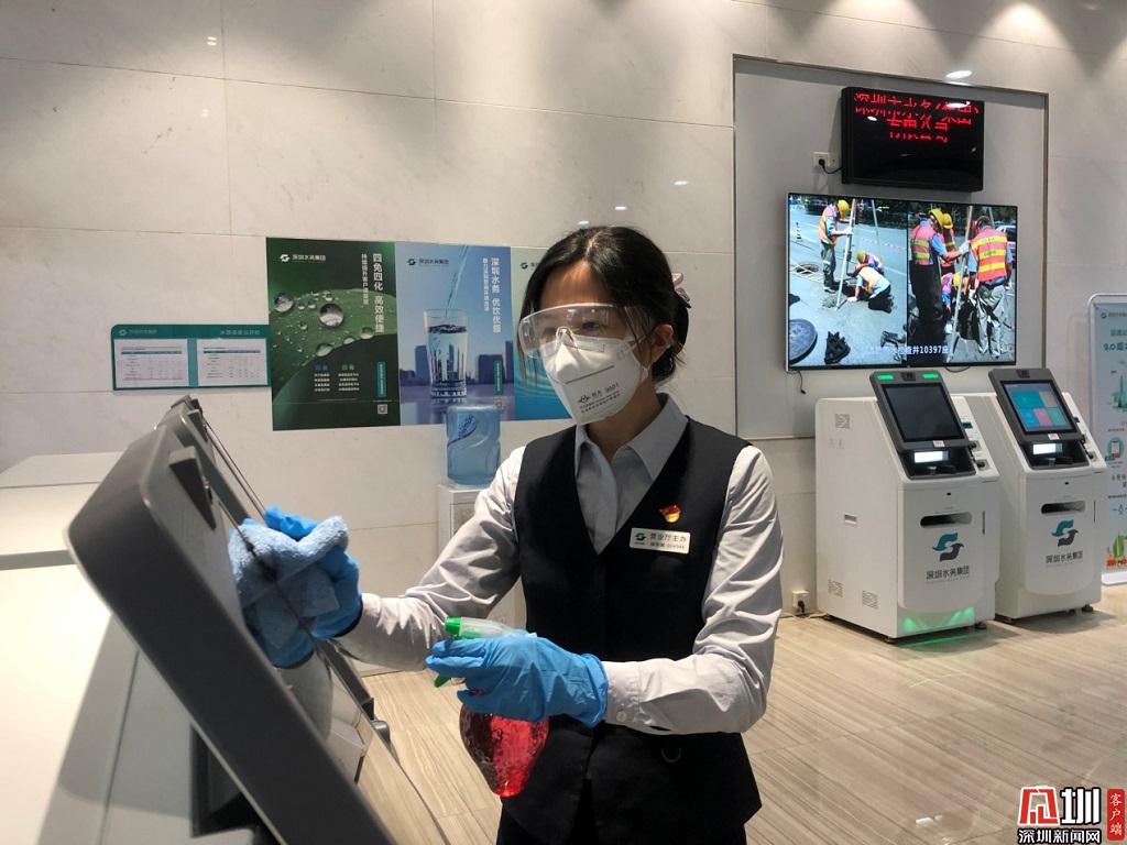 為客戶(hù)提供安全、優(yōu)質(zhì)的服務(wù),是深水人的不懈追求。福田分公司福田營(yíng)業(yè)廳楊麗娜,正對(duì)自動(dòng)服務(wù)機(jī)進(jìn)行消毒。