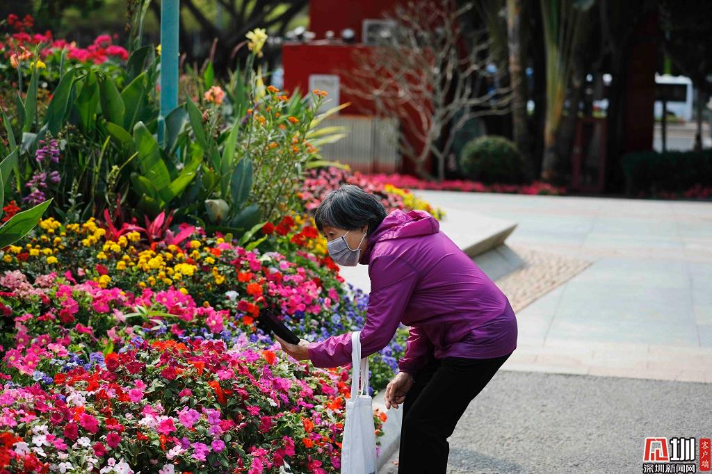 蓮花山公園入口處開滿鮮花,一位市民正在使用手機(jī)拍攝。