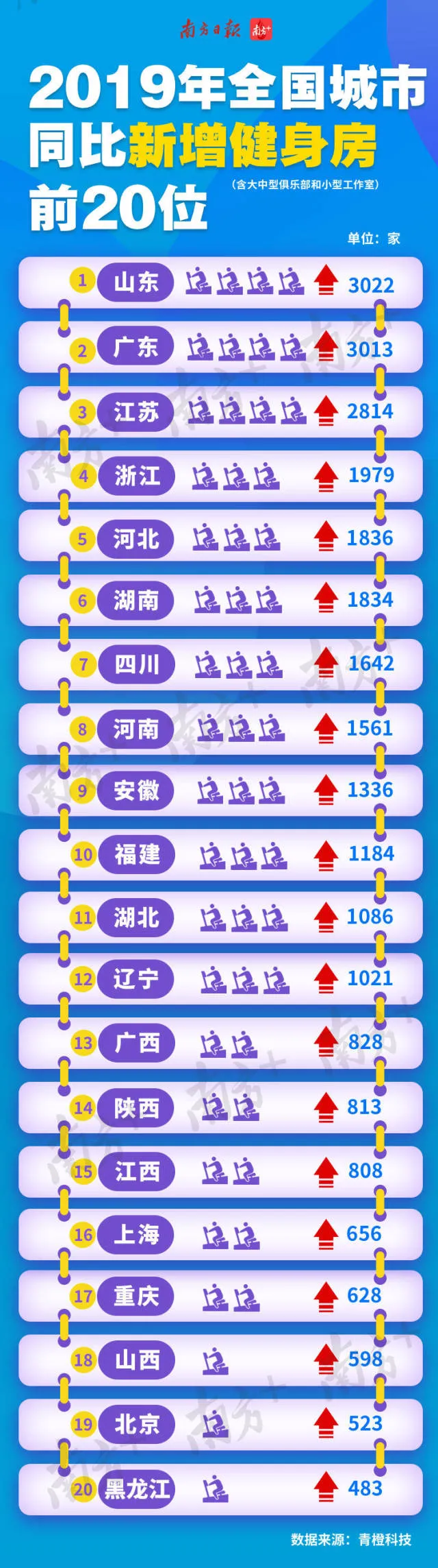 2019年同比增長(zhǎng)了3013間健身房。增長(zhǎng)數(shù)量位居全國(guó)第二,同期僅關(guān)閉127家健身房。