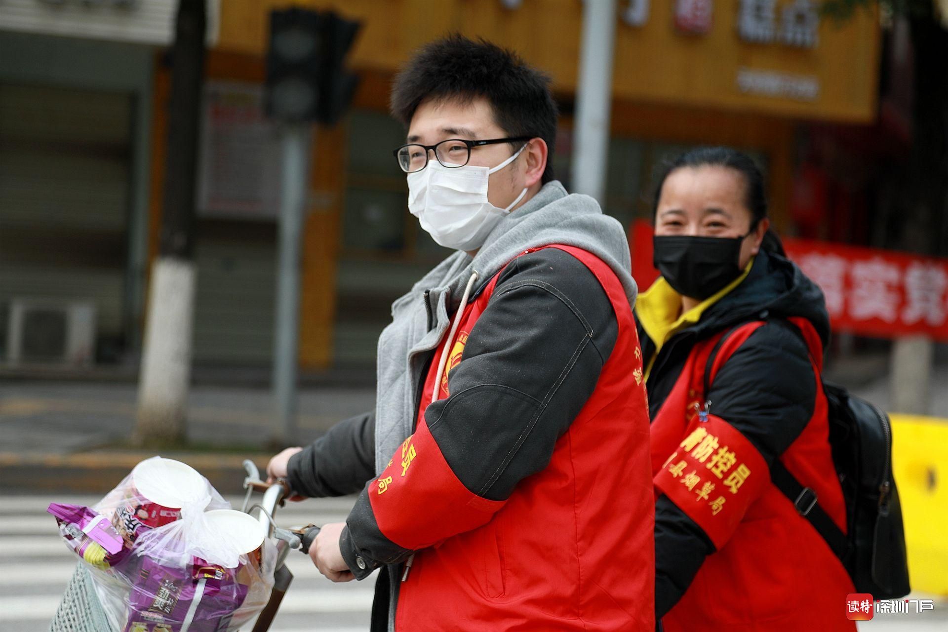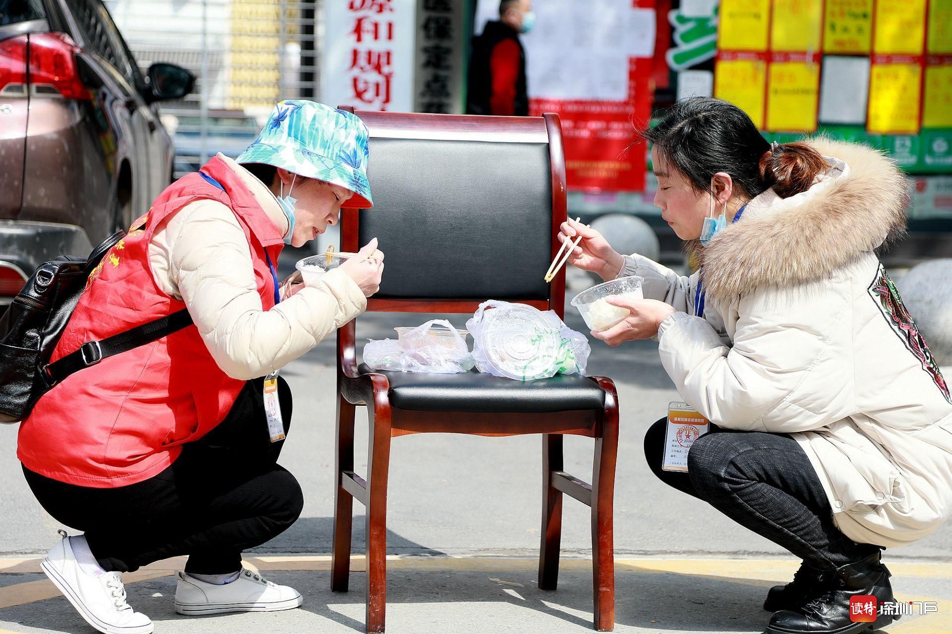 3月7日,監(jiān)利,在街頭執(zhí)勤卡點吃飯的社區(qū)工作人員。