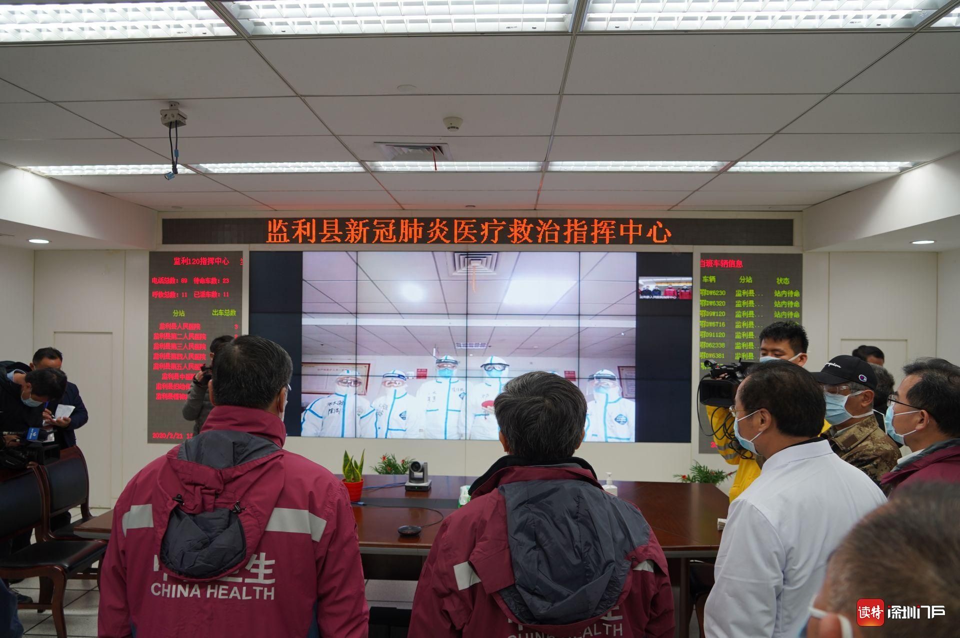 2月21日,監(jiān)利縣人民醫(yī)院指揮中心,廣東省醫(yī)療隊前指領(lǐng)導與縣中醫(yī)院ICU里的廣東醫(yī)療隊隊員進行視頻連線。