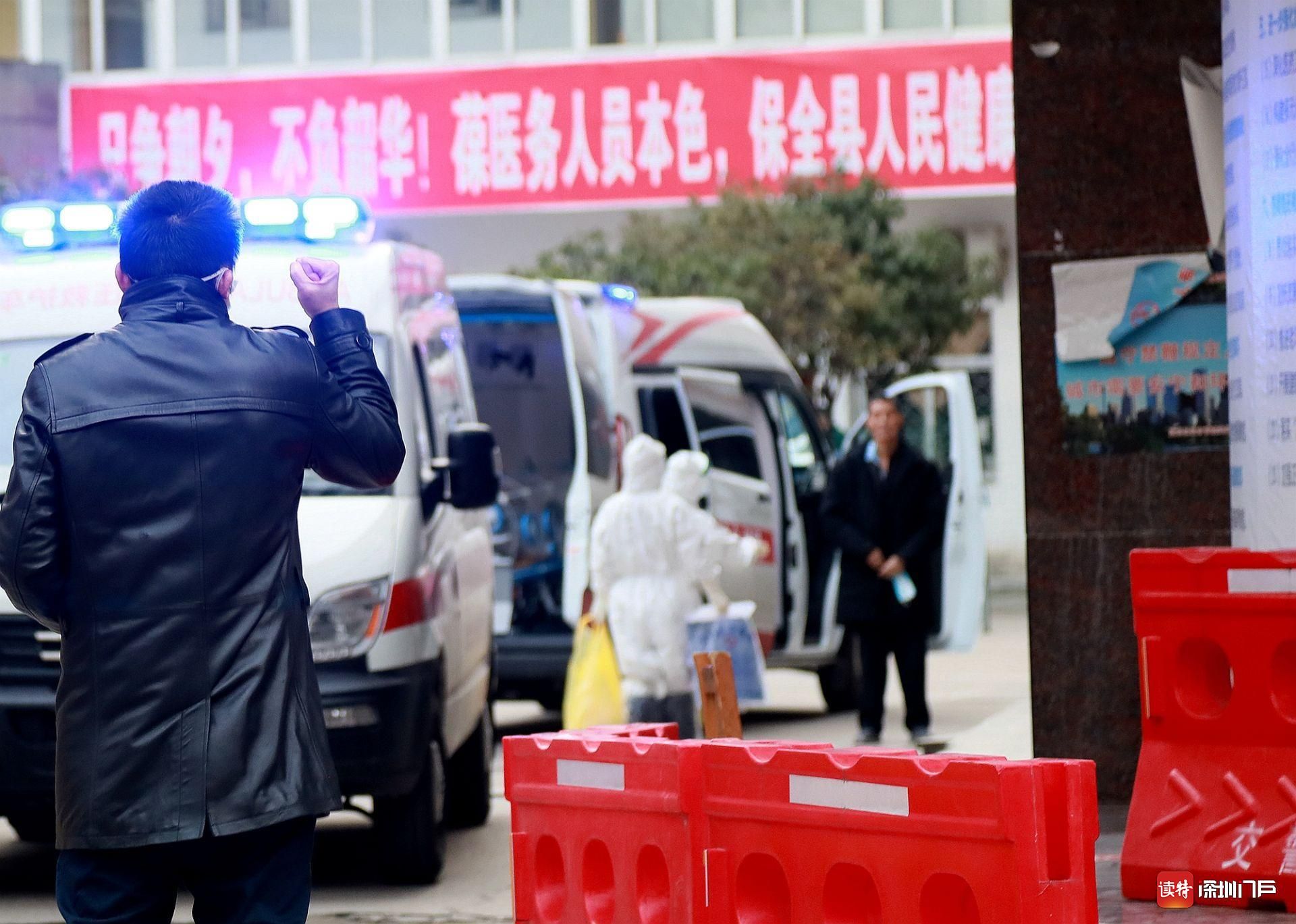 2月29日,監(jiān)利縣中醫(yī)院,一位重癥患者即將轉(zhuǎn)往荊州救治。患者的兒子聞訊趕來,遠遠地向父親舉起拳頭,高喊“加油”。