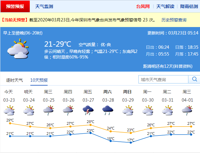 見(jiàn)圳客戶端·深圳新聞網(wǎng)2020年3月22日訊 深圳今天多云間晴天,早晚有輕霧;氣溫21-29℃;東南風(fēng)2級(jí);相對(duì)濕度60%-95%。